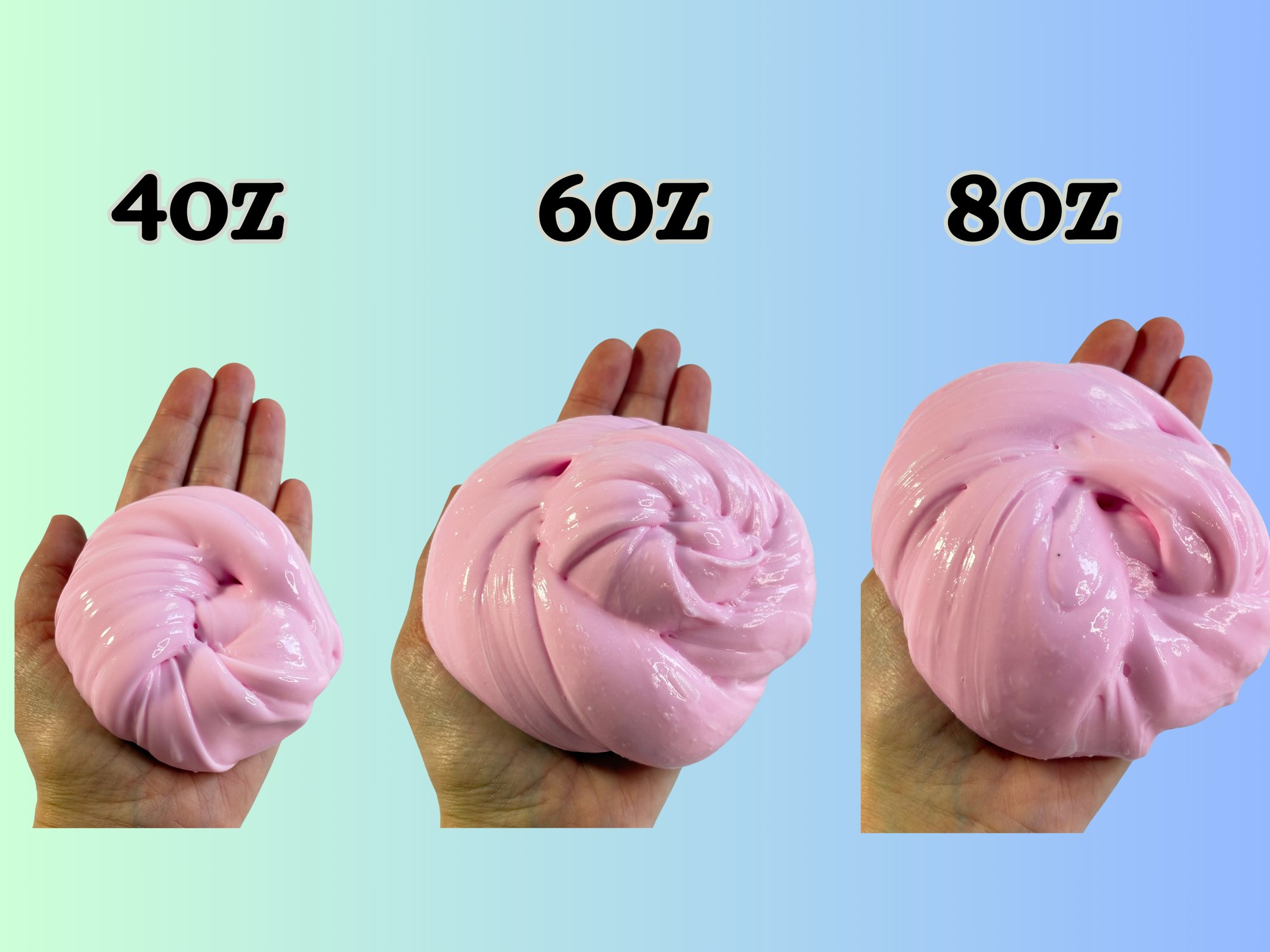 Slime size is measured by volume, not by weight. Slime is packed to the fill line of the container. Due to the different densities of the different types of slime, the weight per container will vary. Slime can and will also change volume when played with.